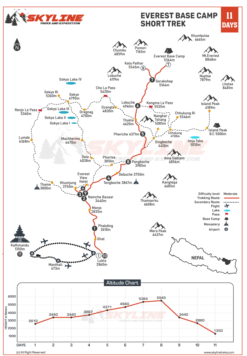 The shortest Base camp Everest is typically completed in about 8-10 days, but it can vary depending on individual trekking pace and acclimatization needs. Here are the key details of the trek without a specific itinerary: