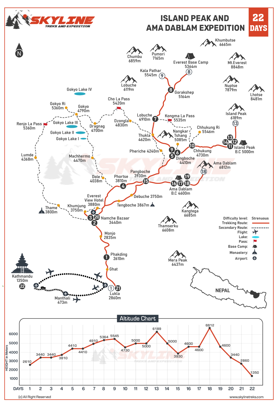 - Day 1-8: Trek from Lukla to Chhukung via Namche Bazaar, Tengboche, and Dingboche.