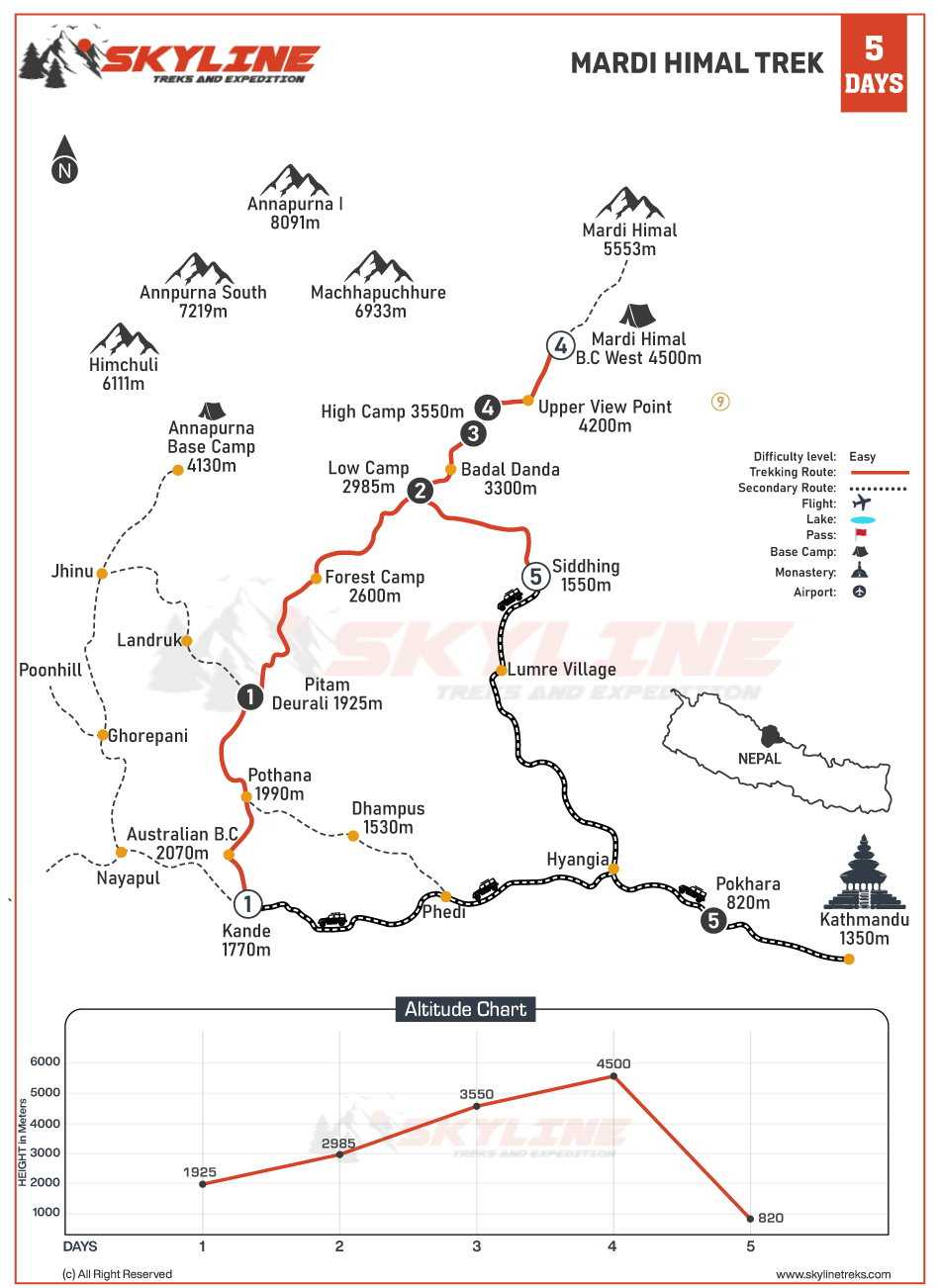 The trekking trail goes from Kande to Australian Camp, Pothana, Deurali, Forest Camp, Low Camp, Middle Camp (Badal Danda), High Camp, and ultimately to Mardi Himal Base Camp. Then it retraces back and deviates from Low Camp to Siding Village. The total distance of the Mardi Himal Trek is 41 km and 25 miles.