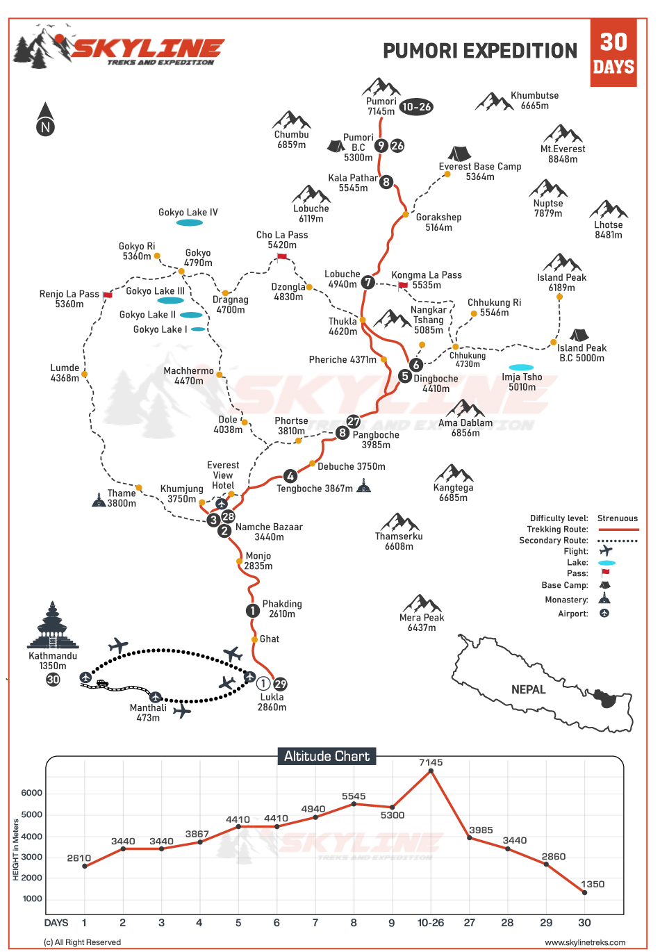 A typical Pumori expedition takes around 30 days to complete, including acclimatization and summit attempts.
